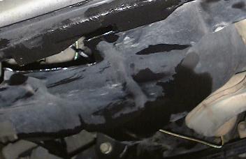 というわけで早速チェックしてみました.今回はジャッキアップせず,(割れた)アンダーカバーのすき間から見てみました.今のところ,漏れはおさまったようです.またしばらくしたらチェックしてみます(実はまだおさまってなかったのでした・・・).