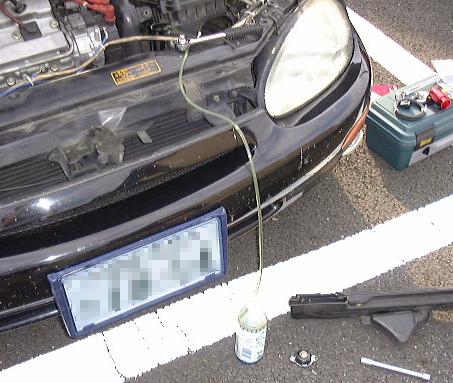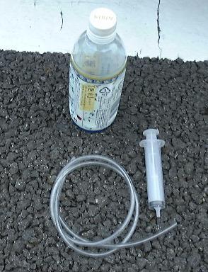 これが,LLC抜きの三種の神器(笑).シリンジは呼び水するためのものです(口で吸ってもいいけど,飲まないようにね).